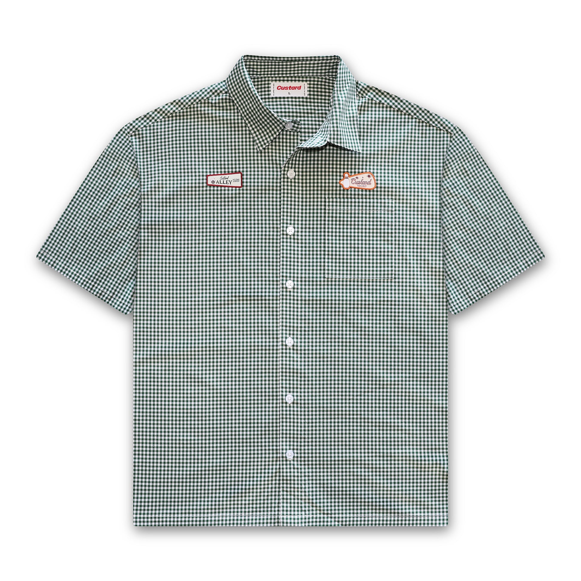 The Bowling Button-Up is crafted from premium cotton and designed with a slightly cropped fit for a modern, elevated look. Featuring boxy sleeves and detailed with embroidered patches on the front, it brings a unique, standout feel to a classic silhouette. Finished with an embroidered Custard carton on the back of the neck, this piece blends timeless styling with signature Custard detailing.
