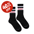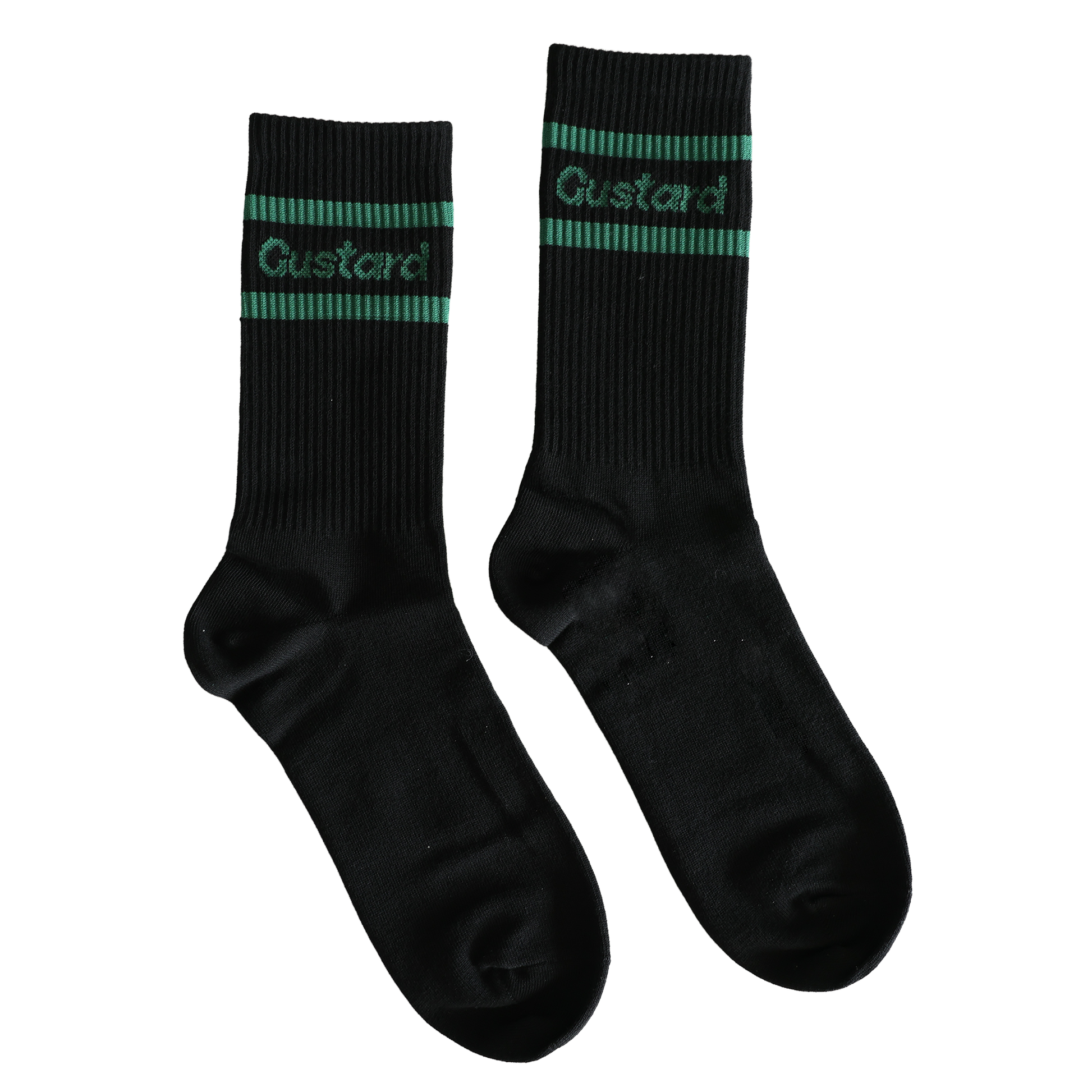Custard Crew socks, featuring a simple Custard® wordmark along the outside of each sock, with a timeless stripe design. Available in black and white. Fits size 7-13.
